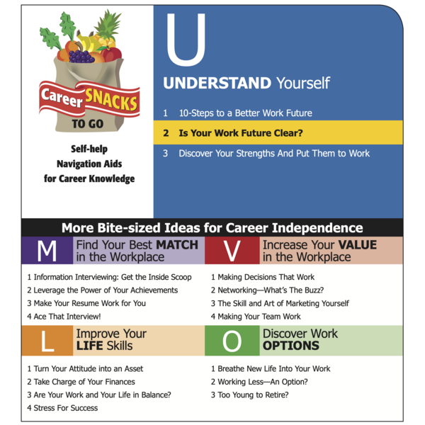 Career SNACKS (Self-help Navigation Aids for Career Knowledge) To Go are concise and fun aids to propel your career to the next level! Each of the five categories – Understand, Match, Value, Life, and Options – contain guides that offer practical tools and tips for achieving success in an ever-changing workplace.